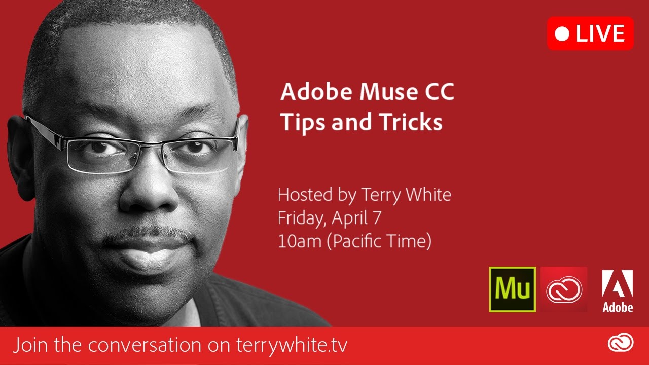 Join Adobe Evangelist Terry White LIVE as he shares a few of his Adobe Muse CC Tips & Tricks. Adobe Muse CC is a great web design tool for designers. These hidden gems should come in handy.